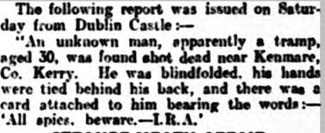 "..the IRA decided that the tramp , Sardy Nagle, was indeed a spy. One man reported to Captain O'Sullivan in Killarney having heard him giving information about the IRA to Captain O'Sullivan in Killarney. The man is reputed to have recognised Sardy's voice because he sang a song for which he was noted "take me back to my dear old mother and there let me live and die" This was enough to seal his fate. Tom McEllistrim shot him and his body was dumped on the Kenmare - Headford road, about two and a half miles from Kenmare, at Claidy Cross, where he was found on Good Friday morning. He had been blindfolded, his hands had been tied behind his back and around his neck was a card bearing the words "All spies beware - IRA" He had been shot three times in the head and three times in the heart"