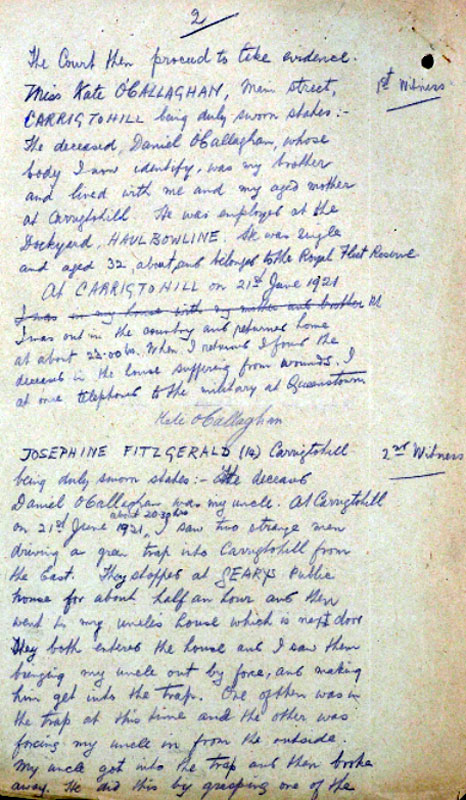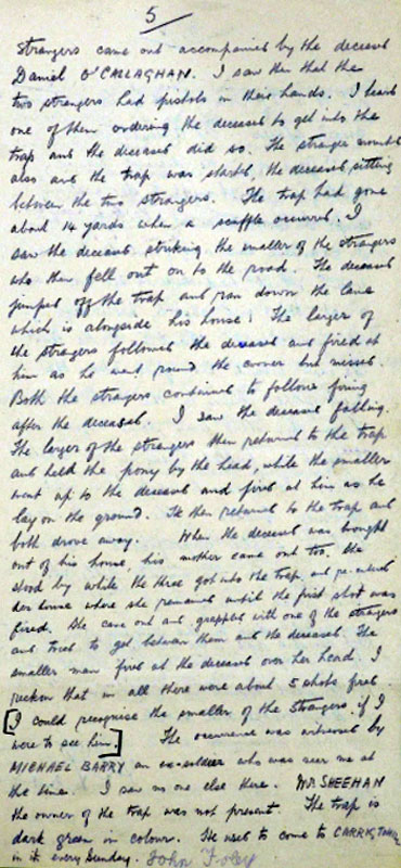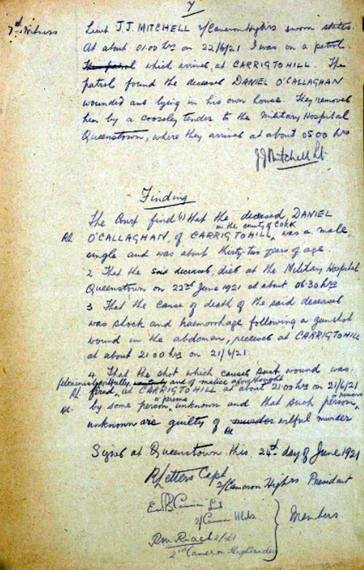 Thomas Cotter, a lieutenant in the Carrigtwohill IRA Company, later claimed responsibility for executing O’Callaghan as a spy. See Sheehan (2011), 76. Cotter named his associates in executing O’Callaghan as Volunteers Harry O’Brien of the IRA First Southern Division Engineers unit; M. McCarthy of E Company (Knockraha) of the 4th Battalion; and P. Mahony of Anngrove (Carrigtwohill). See Seámus Fitzgerald Papers, PR/6/32 (2), (UCC).