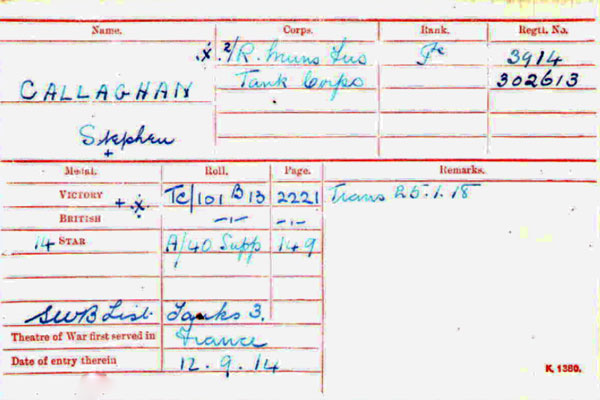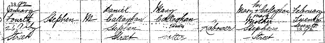 Born Cork in Jan 1892, the son of Daniel Callaghan, a bacon curer , and Mary (nee Cotter). The family appear to have added the "O" to Callaghan between 1901 and 1911. But Stephen served as "Sephen Callaghan"