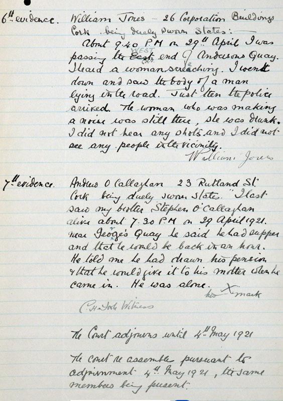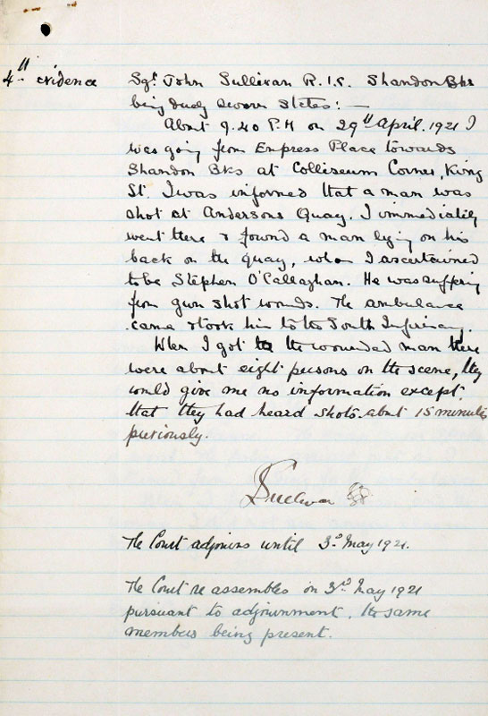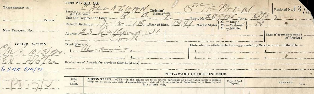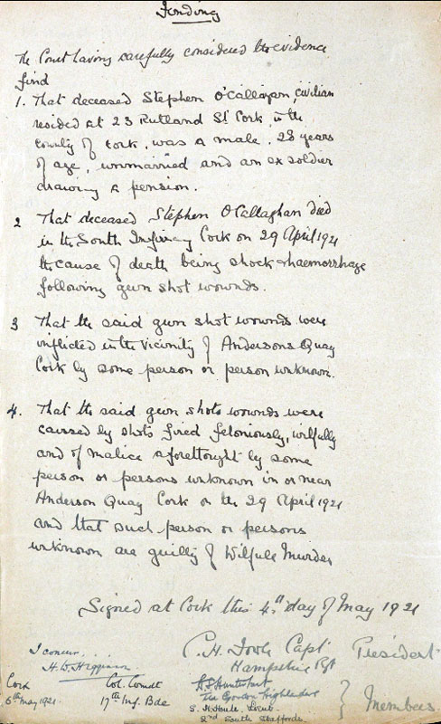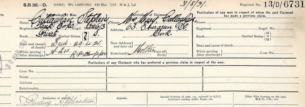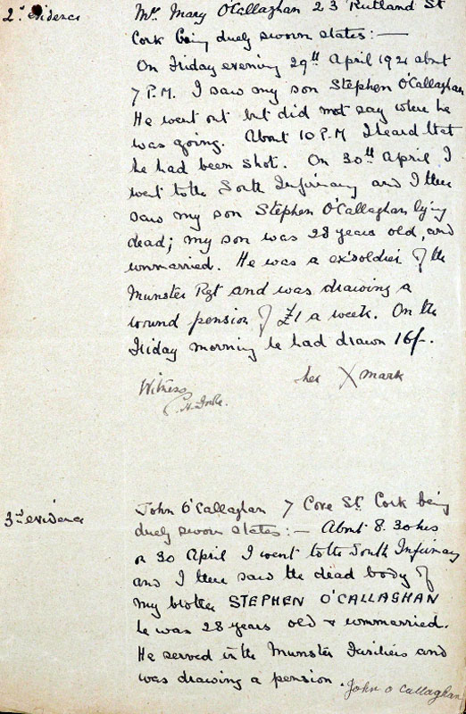 During the Great War, O’Callaghan had served with the Royal Munster Fusiliers and had a wound pension. When shot in 1921, he was an unemployed dock labourer drawing a military disability pension of £1 weekly. The inquest shows his mother was "Mary" and he had a brother "John"