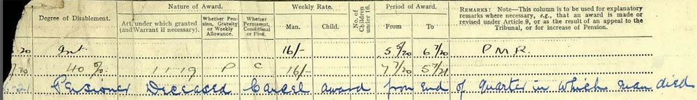 The inquest evidence established that he served in RMF and had a wound pension of £1 a week. However there are 2 pension cards for him. One with address of 23 Rutland St (his mother's in 1921) and the other as 63 Evergreen St (his siblings in 1922) Both these are correct, therefore he served in RAF and Tank Corps. However the other Military records shows that "RAF" should read "RMF". The MIC card below confirms his service as do SWB records