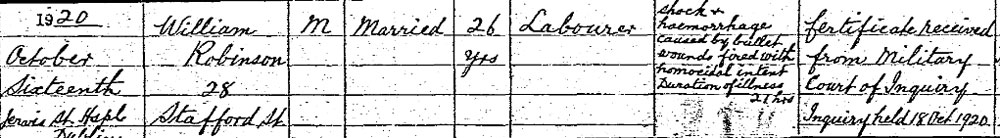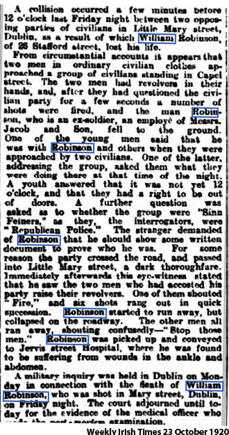 1920 Oct 16. William Robinson shot on Little Mary St & Capel St, Dublin by ’Republican Police’. Died in the Jervis Street Hospital. Born 1894 aged 26 lived at 26 Stafford Street. Served as 10880 Private William Robinson, Royal Irish Fusiliers