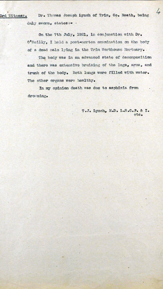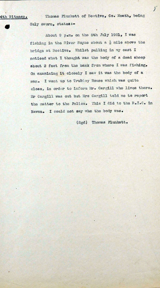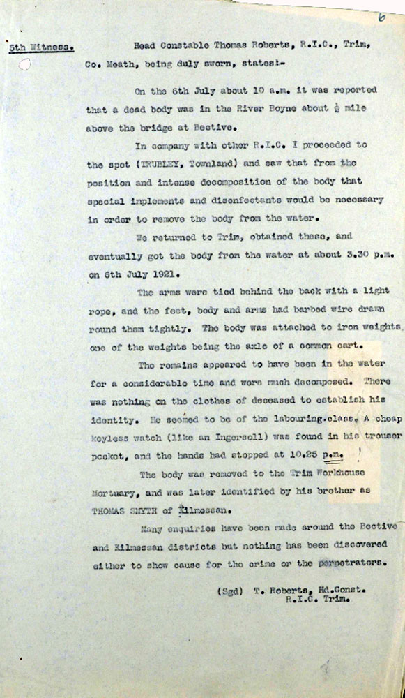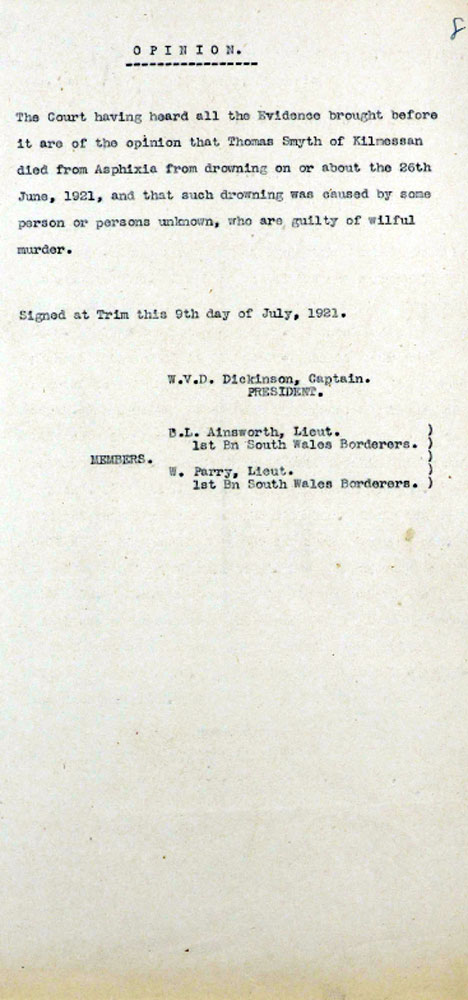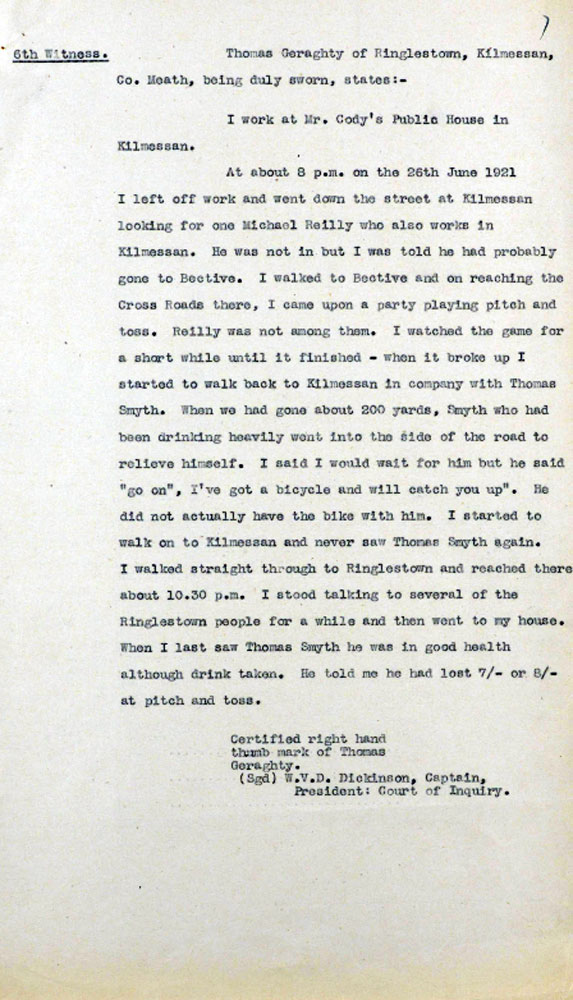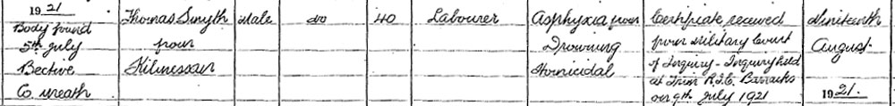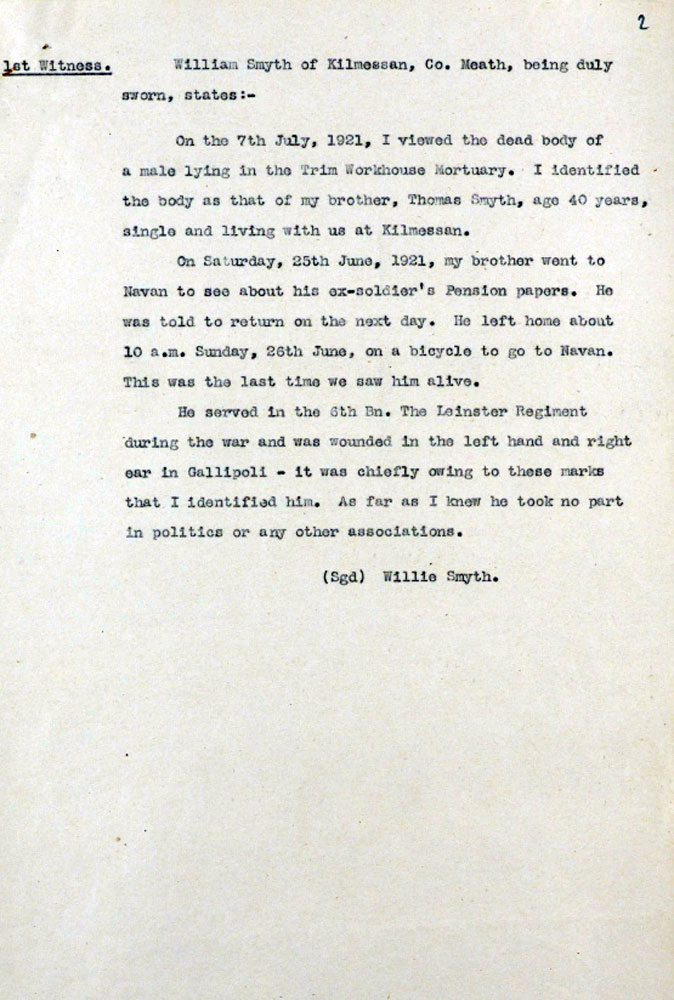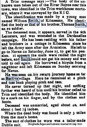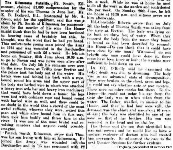 The body of Thomas Smith was found at Bective, County Meath on 6 July 1921. However the state of decomposition of the body indicates that Smith had been dead for some time and was probably killed in late June.