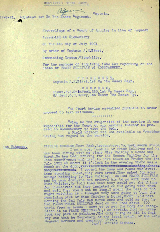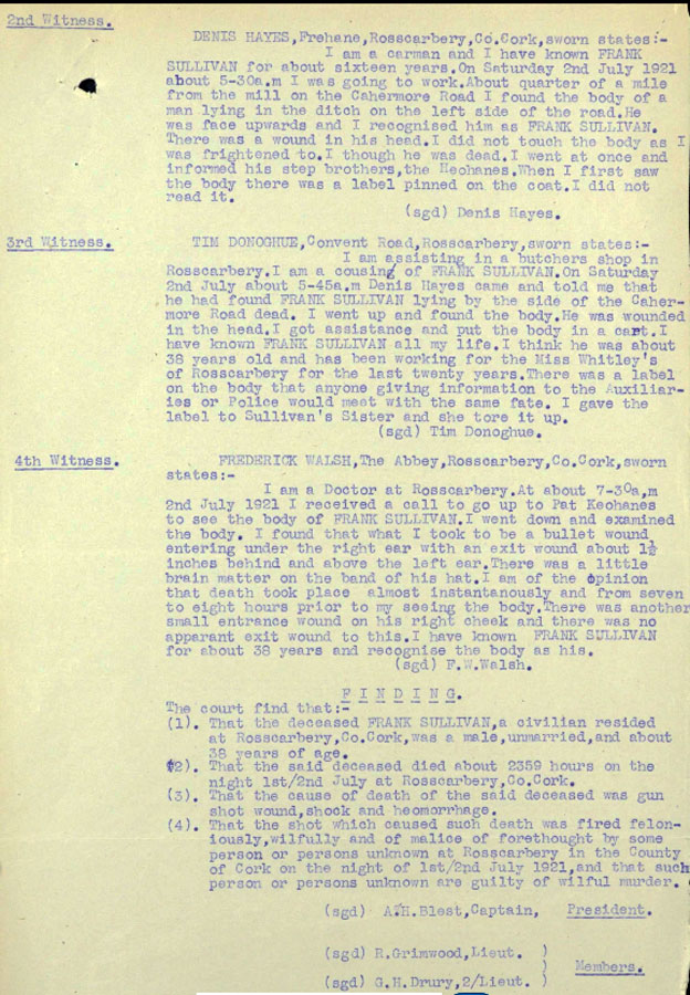 The IRA Witness statement names him incorrectly as Frank O'Donoghue. His name was Frank Sullivan, and the inquest gives Frank Sullivan. The IRA man who did the job was a hit man, and just got the name wrong (Frank Sullivans mother who had remarried was nee Donoghue, so that might have confused the issue). The references to Miss Whitley confirm his name