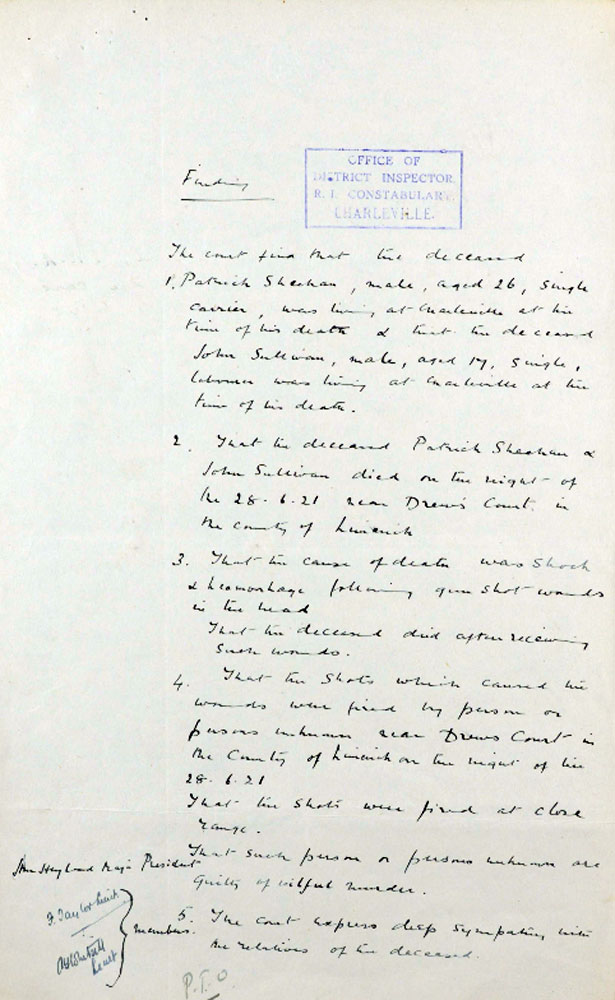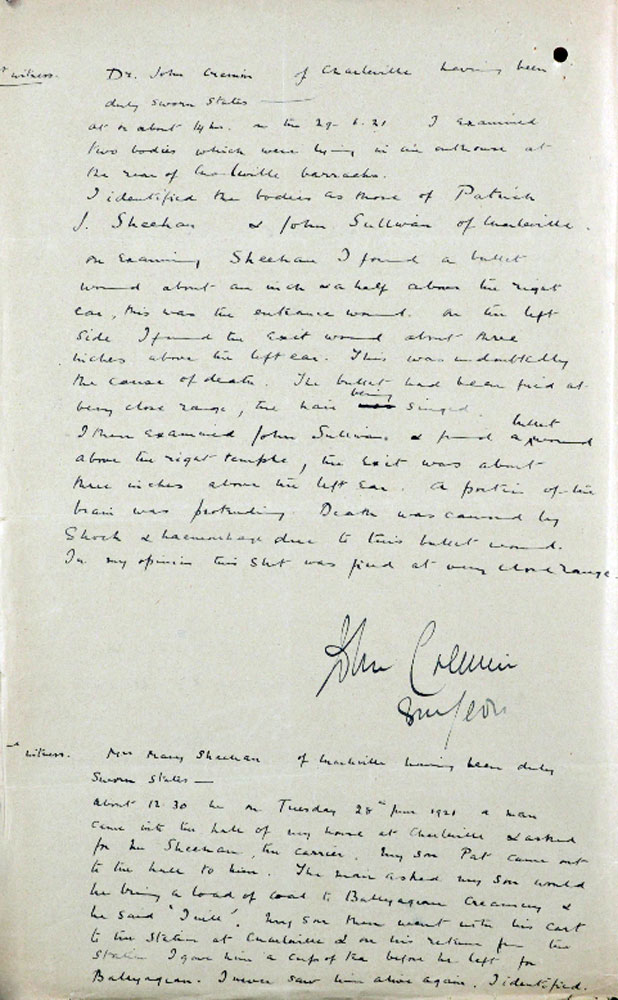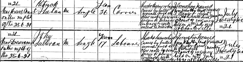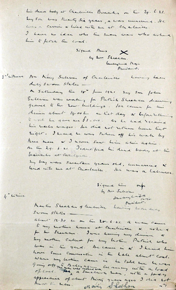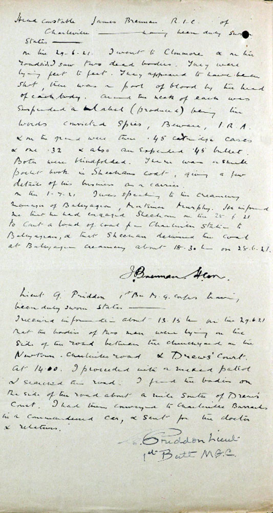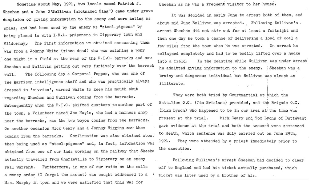 IRA Witness Statement - One evening while a prisoner in Buttevant Military Barracks I was on my way with other prisoners from the compound, where we had been at exercise, to the Guard Room when a soldier named "Slag" Sullivan from Charleville walked up to me. I asked him what brought him to Buttevant Barracks and he told me he was after joining up and was waiting for a draft to India. As a prisoner from Mallow area was being released I sent word to the Charleville Battalion I.O. that Sullivan was in Buttevant. He was later taken prisoner by the I.R.A. and was, I believe, held in the Milford area until hewas shot with his pal. Patrick J. Sheehan, as spies in,I think,June1921.