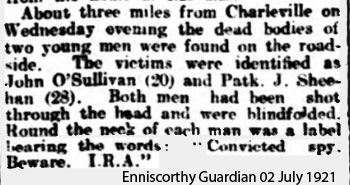 IRA Witness Statement We were removed to Buttevant military barracks where we were held for some days. While there, we saw a man named Sullivan from Charleville associating with the enemy. We sent word to the Battalion I.O., by a Mallow prisoner who was being released, that Sullivan was apparently in touch with the enemy. Sullivan was later taken prisoner by the I.R.A. and was held a prisoner in the Milford Company area until his execution, together with his fellow conspirator -P.J.Sheehan- as spies sometime in June,1921 I think.