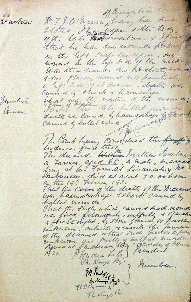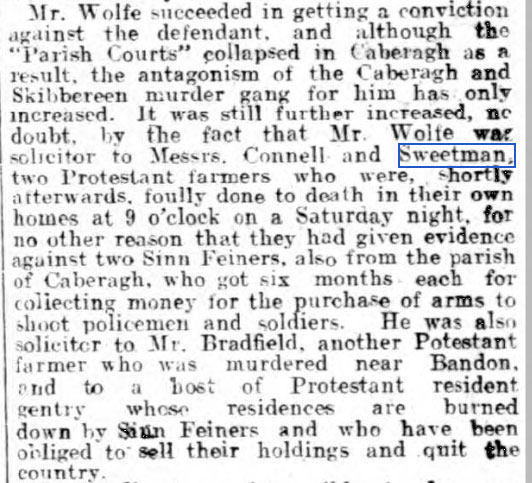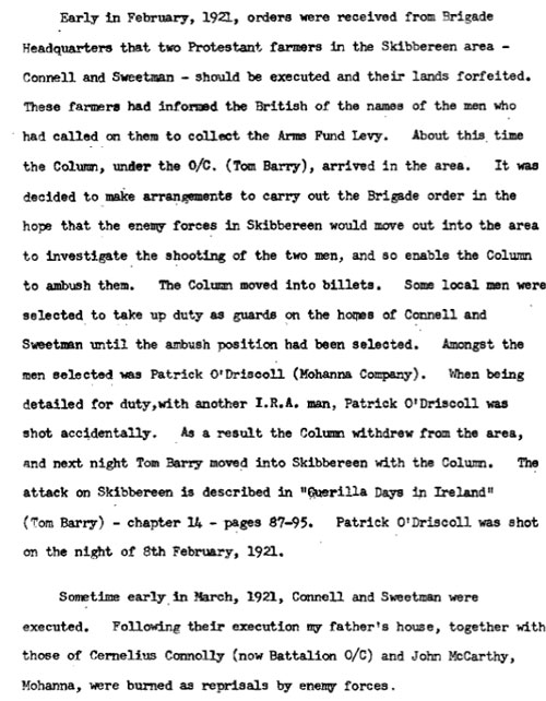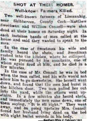 IRA Witness Statement In February1921,two farmers in Mohanna area William Connell and William Sweetman who had informed on members of the I.R.A. who had collected the arms levy from them were executed by elected members of the Lisheen company. I do not recollect the names of the men who took part.