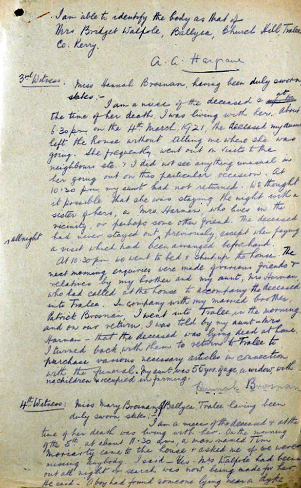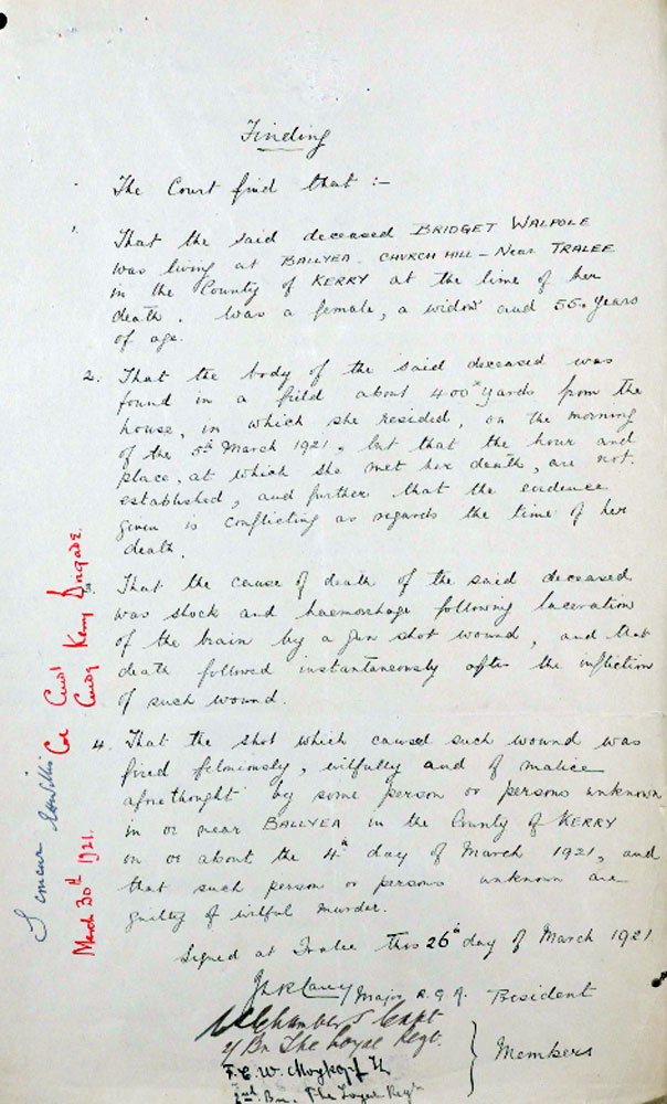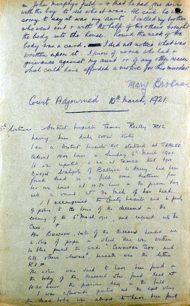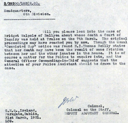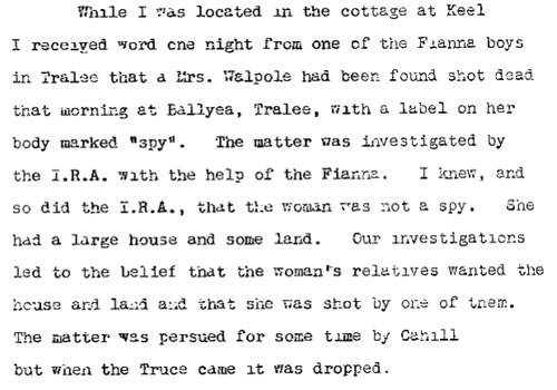 IRA Witness Statement A short time afterwards I came to Ballygarron, Spa, to the house of a man named Rail. There I was informed that a woman named Mrs.Walpole was found that morning shot dead on the side of the road with a label on her chest which read shot as a spy'. I knew this could not be correct as I had stayed at her house several times since I first went on the run. I investigated the matter and discovered that the shooting was the result of a family row.