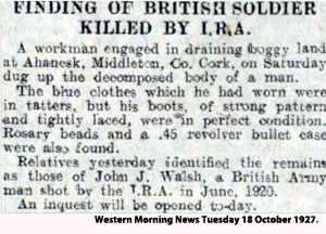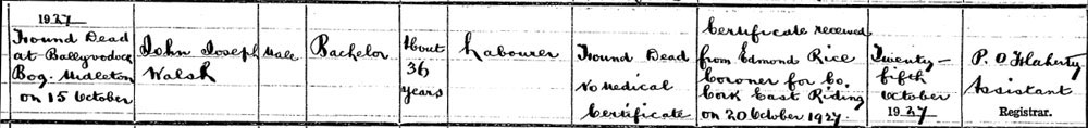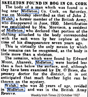 1927 Oct 15. Body exhumed. Testimony given at the coroner’s inquest held at the Midleton courthouse on 18 October indicated that on 15 October 1927 a farm labourer named John Sinclair, who had been opening a drain at Ballyvodock near Midleton, had found a human skull above ground and then other human bones. He and the owner of the land initially covered up the bones, but on Sunday morning, 16 October, they reported their discovery to the Civic Guard, who quickly exhumed the remains and ‘found portions of clothing in a rotting condition. They also found a rosary beads attached to the clothes, the case of a revolver bullet, a comb, [and] a pair of boots, out of which the bones were protruding.’ The victim’s brother Timothy Walsh of Dickinson’s Lane, Midleton, also identified the clothing, belt, and boots (with rubber heels) as those of his brother John Joseph Walsh (a labourer aged ‘about 30’ at death), whom he had last seen (he said) on 7 or 8 June 1921, when his brother had disappeared from the Midleton house of his aunt Bridget Morrison. [Bridget Morrison and her husband Patrick resided at 3 Dickinson’s Lane in Midleton in 1911.] The coroner’s jury accepted the evidence of Timothy Walsh as accurate in identifying the deceased as John Joseph Walsh. See Cork Examiner, 19 Oct. 1927.