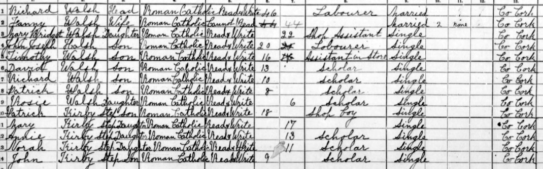 1911 census Living at Chapel Rd, Midleton. His mother has now died, and his father has remarried.
