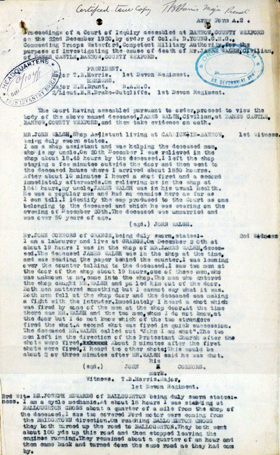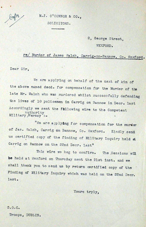 1920 De 20. Shot Bannow , Wexford during an IRA attack on the RIC Barracks